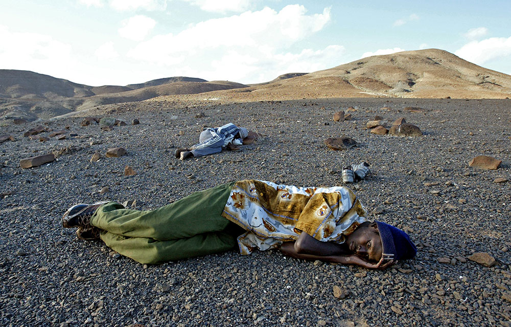 Il y a quelques années, j’ai commencé à photographier la détresse des milliers de personnes qui essaient d’atteindre la côte des Iles Canaries, où je vis, au péril de leur vie, et je n’ai pas cessé d’être le témoin de cette tragédie humaine qui se répète avec une régularité déconcertante. Cette longue et périlleuse odyssée commence, en général, en Afrique occidentale lorsqu’ils quittent leur pays d’origine ravagé par la famine, la guerre, l’exploitation et les trafics. Bien avant d’atteindre la côte africaine, un grand nombre d’entre eux meurent en traversant le désert. Si ce n’était les récits de parents ou de compagnons de voyage plus chanceux, personne ne saurait jamais ce qu’il est advenu d’eux. Pour certains, il faut des années avant de pouvoir entreprendre la traversée des cent kilomètres d’océan qui séparent le continent africain de l’archipel espagnol. Ils naviguent dans de frêles esquifs de moins de six mètres de long. La plupart de ces embarcations sont interceptées ou secourues par des patrouilles de garde-côtes espagnols ou d’autres navires de sauvetage, mais certains de ces bateaux de fortune surchargés chavirent en plein océan. D’autres se perdent et le bateau se met alors à dériver, condamnant ses occupants à une mort lente et certaine s’ils ne sont pas secourus à temps. Des milliers d’êtres humains se sentent obligés d’entreprendre ce dangereux périple imposé par le filtre cruel de l’Europe.