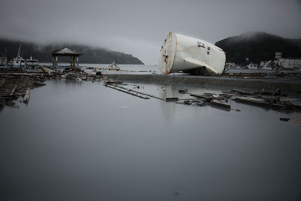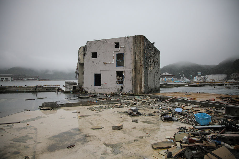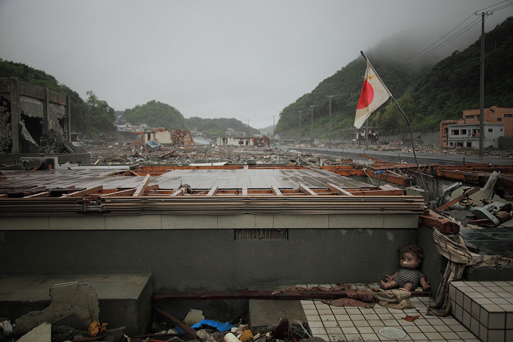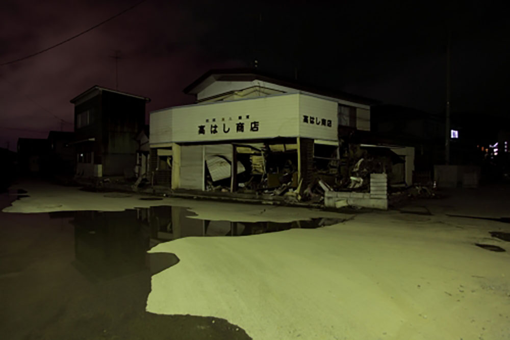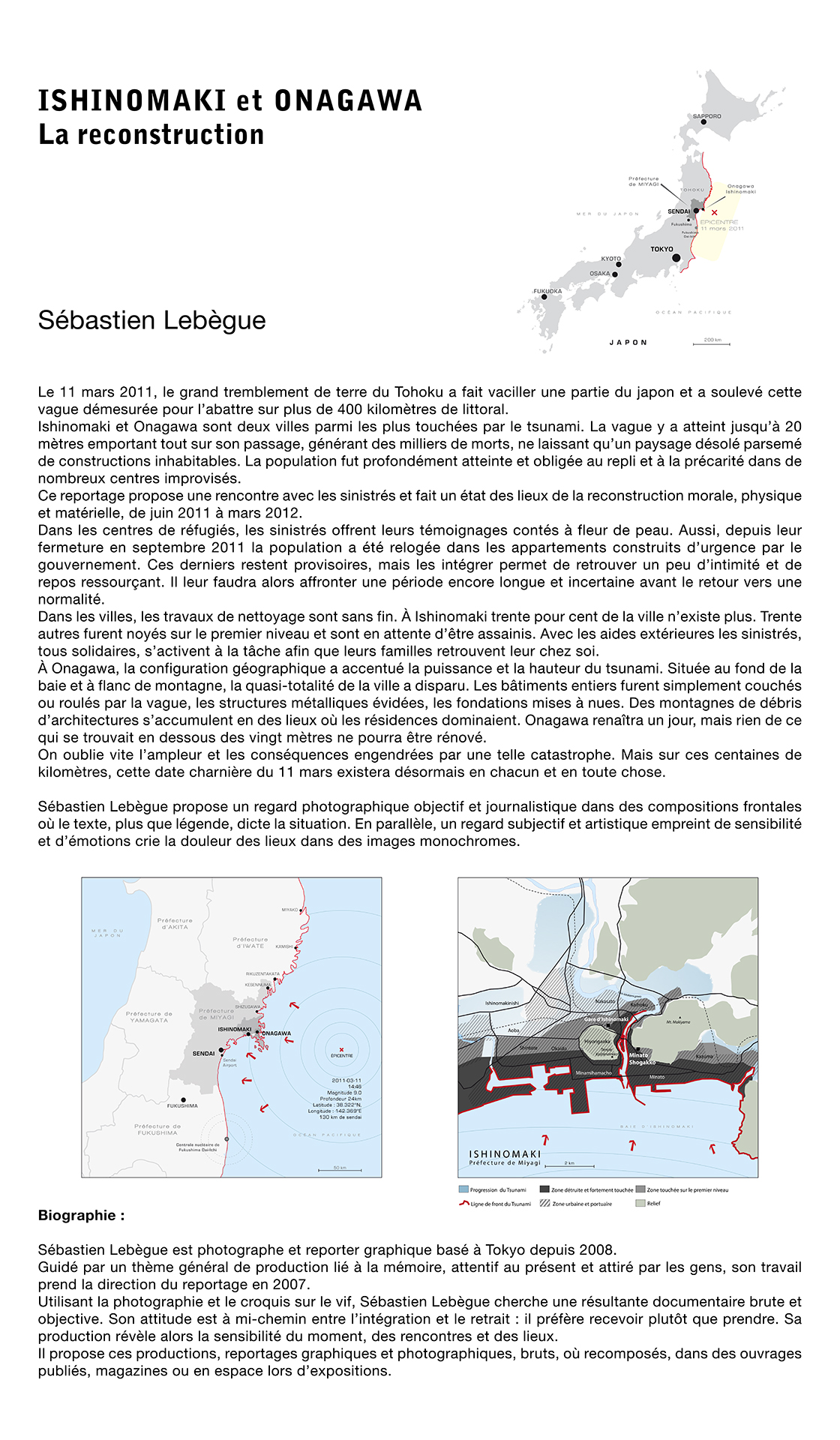 Le 11 mars 2011, le grand tremblement de terre du Tohoku a fait vaciller une partie du Japon et a soulevé cette vague démesurée pour l’abattre sur plus de 400 kilomètres de littoral. Ishinomaki et Onagawa sont deux villes parmi les plus touchées par le tsunami. La vague y a atteint jusqu’à 20 mètres emportant tout sur son passage, générant des milliers de morts, ne laissant qu’un paysage désolé parsemé de constructions inhabitables. La population fut profondément atteinte et obligée au repli et à la précarité dans de nombreux centres improvisés.