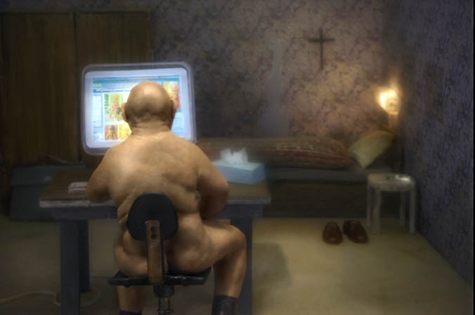 Soon enough I realized that I needed to get physically involved in the project. I had to make everything myself. I began to build little cardboard boxes with detailed interiors and lighting design. I sculpted the characters and arranged them in scores of scenarios, which I then photographed. Creating the little figures could take several days. As I molded them, smoothing their cheeks and bellies with my fingers, I grew close to them, close enough to share their feelings: not only the victim’s pain but the predator’s excitement, too. It was a frightening experience, believe me.