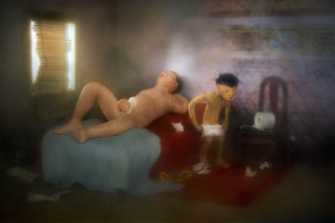Je faisais tout moi-même, de mes mains : j’ai construit des pièces à la déco et à l’éclairage soignés. J’ai modelé les personnages, je les ai disposés de manière à évoquer des scènes épouvantables. Et puis ces scènes, je les ai photographiées.