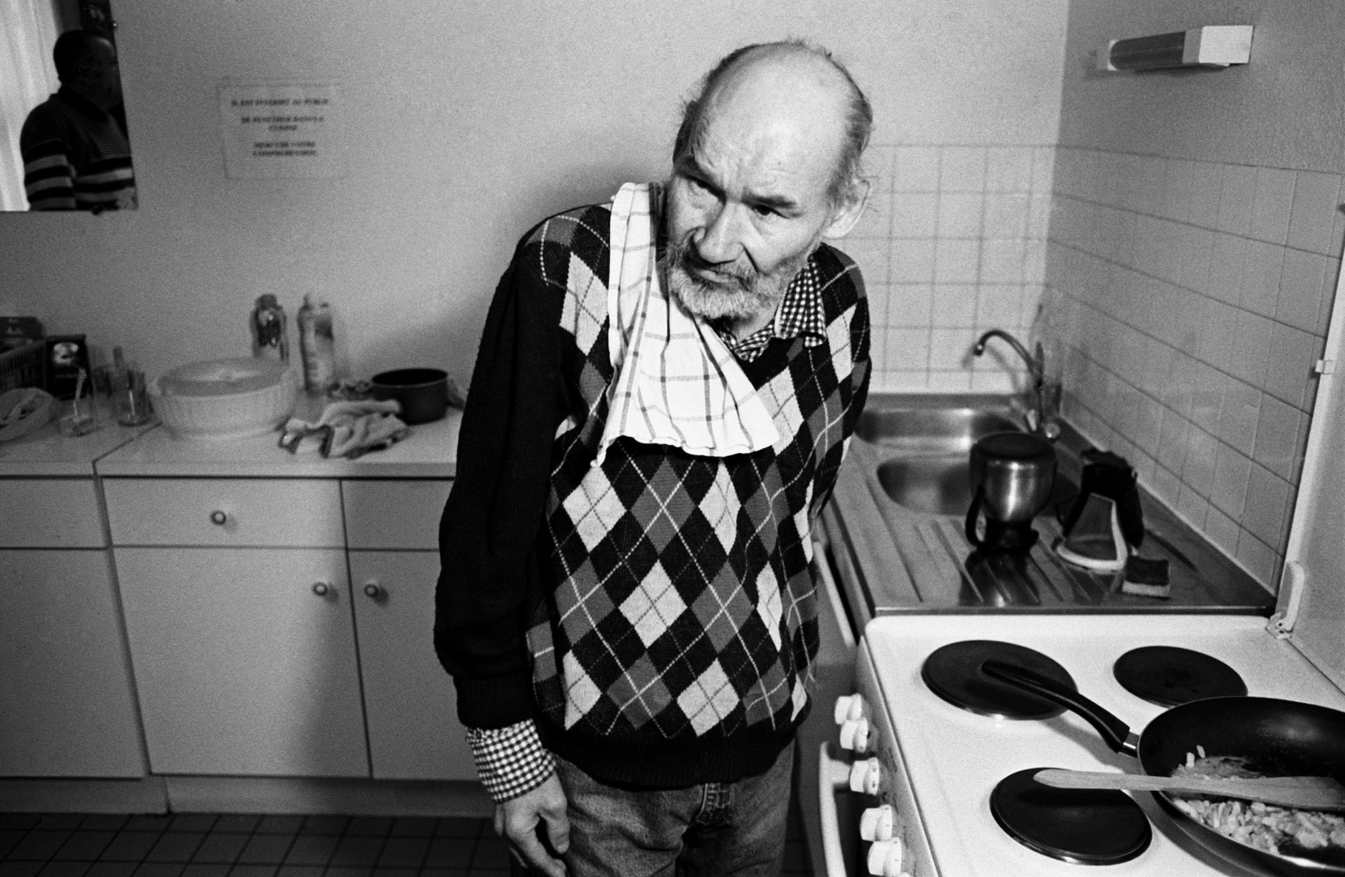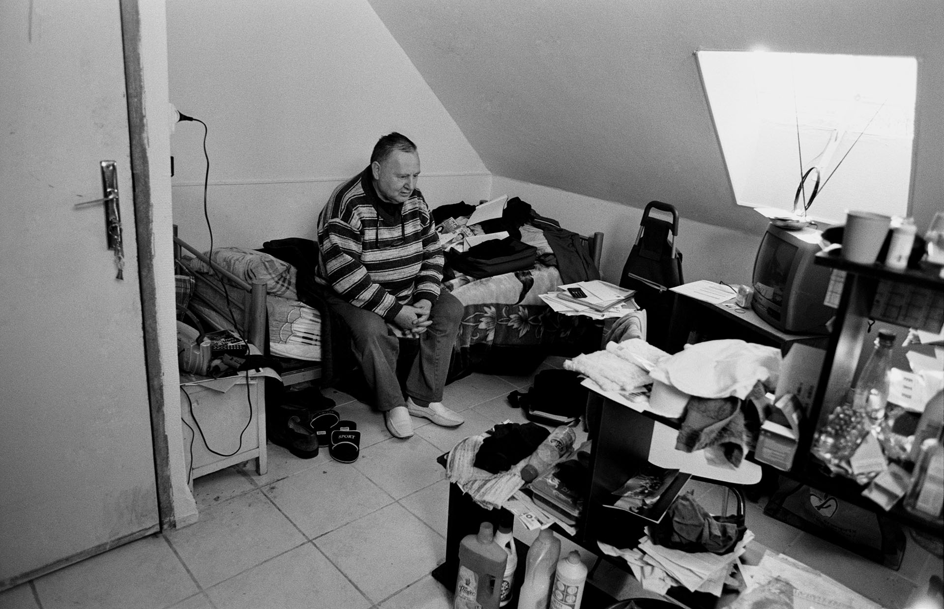 J’avais élu mon quartier général à « l’Etape », lieu de vie des petits frères des Pauvres qui accueillent des personnes dans la précarité. J’arrivais pour le petit-déjeuner, je discutais avec les gens, je leur parlais de mon projet. Beaucoup ont refusé. Peur de se montrer, de parler ou d’être reconnu par leur famille. Il m’a fallu énormément de temps, d’écoute et de proximité pour gagner leur confiance. Au début je leur donnais des photographies. J’ai vite renoncé car je leur offrais une image d’eux qu’ils refusaient de voir. Finalement j’ai fait peu de photos. On se rencontrait régulièrement. On prenait un café, on discutait. Je me sentais plus bénévole que photographe et cela me plaisait.