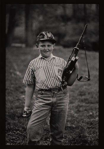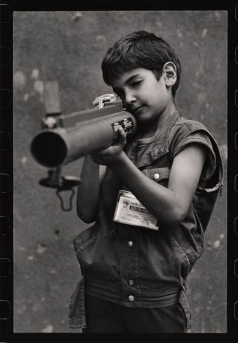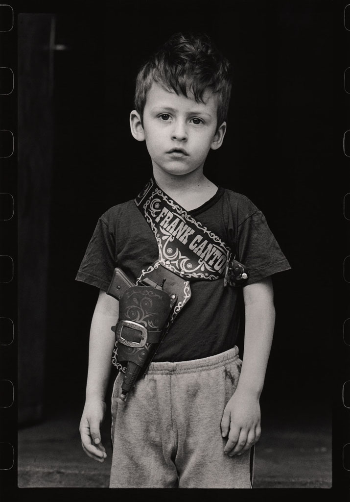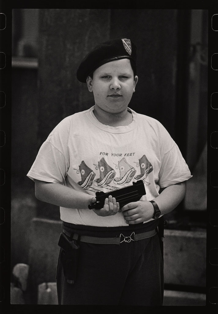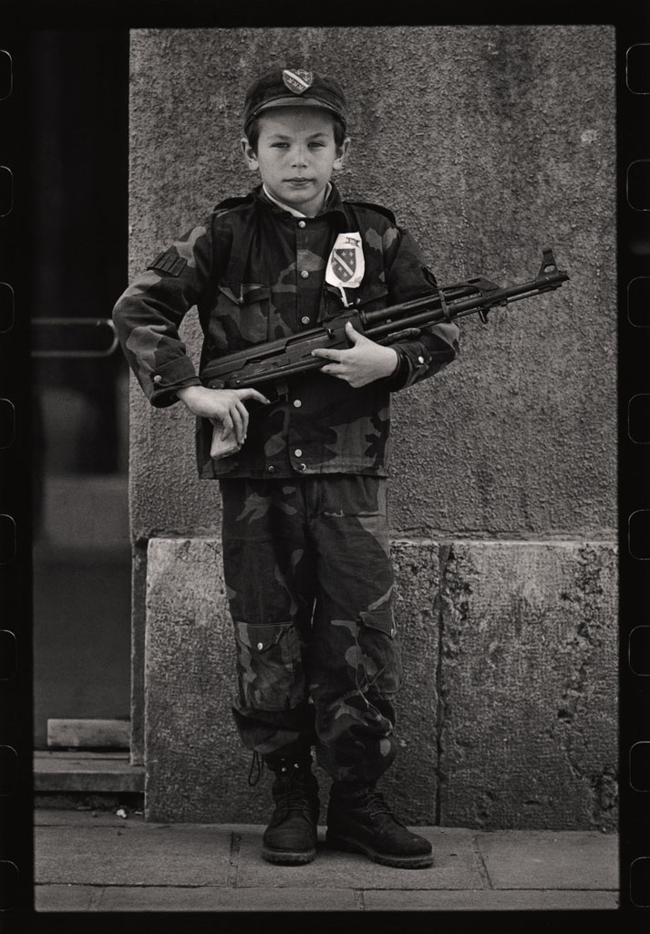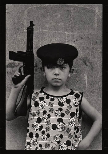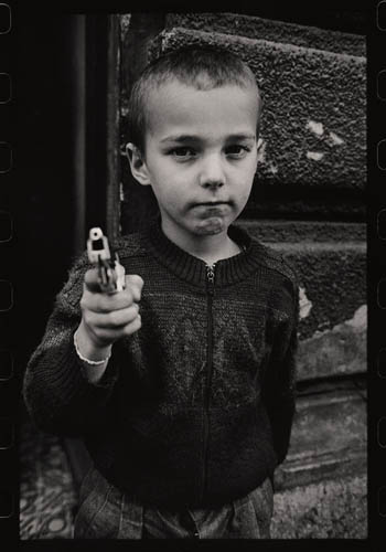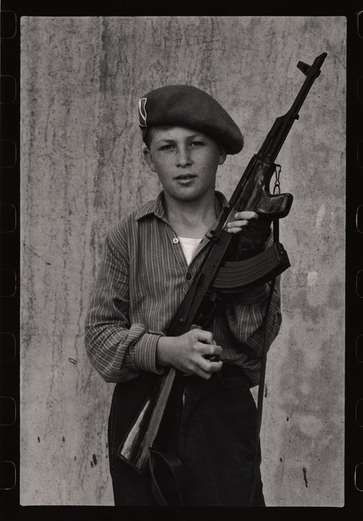 Ils se fabriquaient les pistolets en bois, utilisaient les grenades qui ont déjà servi, faisaient eux-mêmes les gilets pare-balles en carton et les fusils en tubes d’acier, montaient la garde, construisaient des cachettes, des uniformes et des accréditations sur lesquelles on pouvait lire « La police des enfants ». Cependant, pour les besoins de la série de photos présentée ici, ils posaient souvent avec les véritables armes « empruntées » à leurs parents. Innocents, ils imitaient ainsi les grands ; c’était leur façon de se protéger et de se sentir en sécurité.