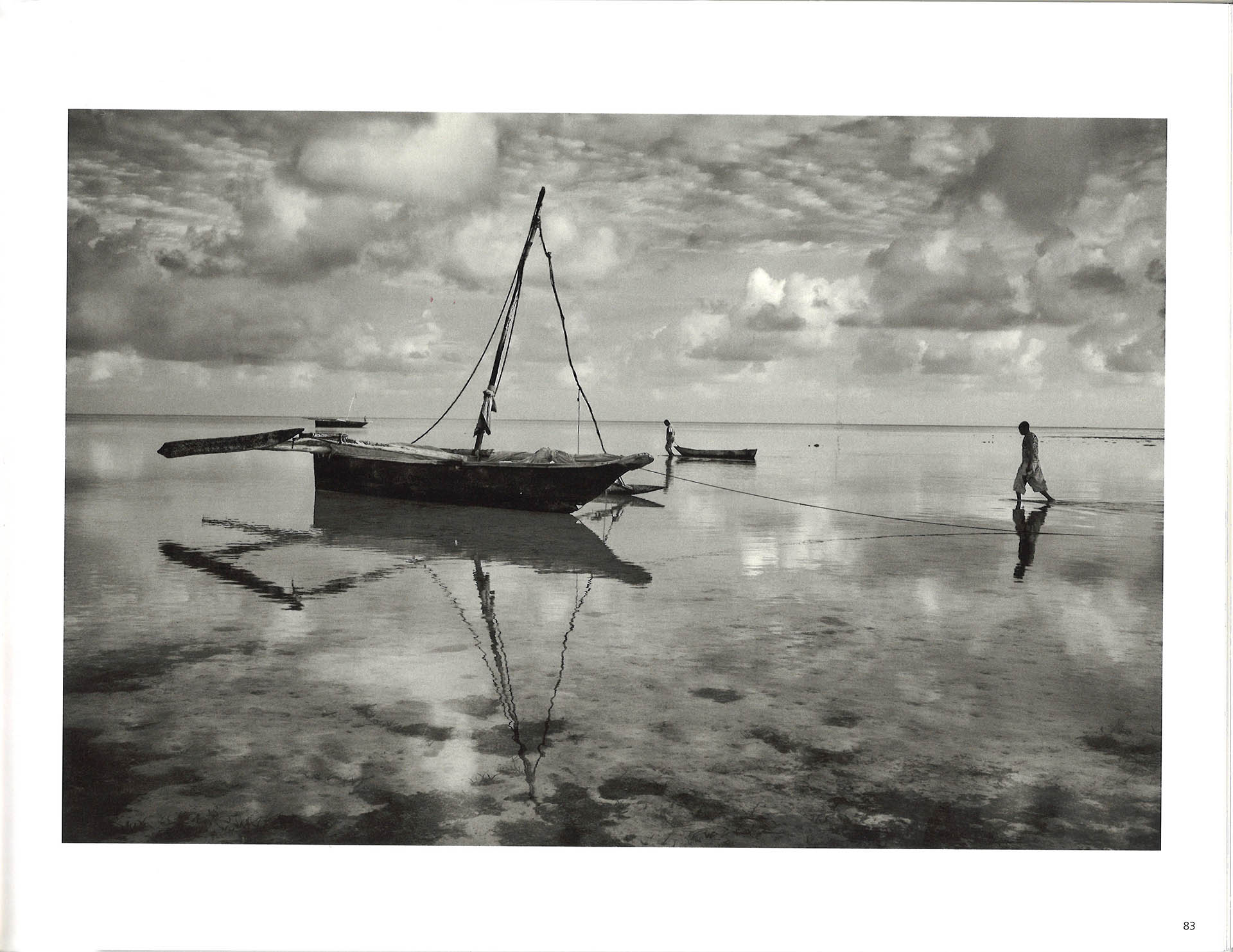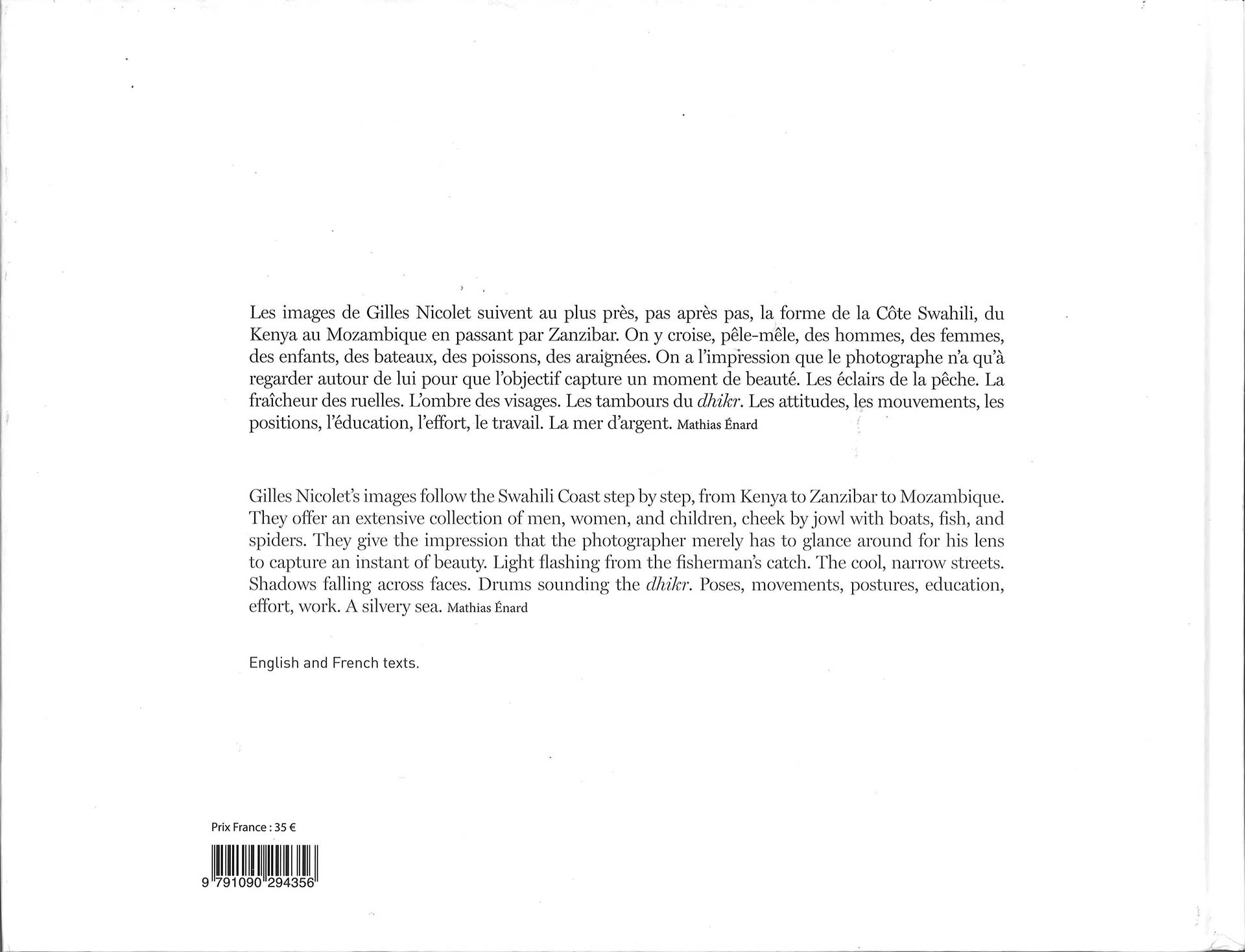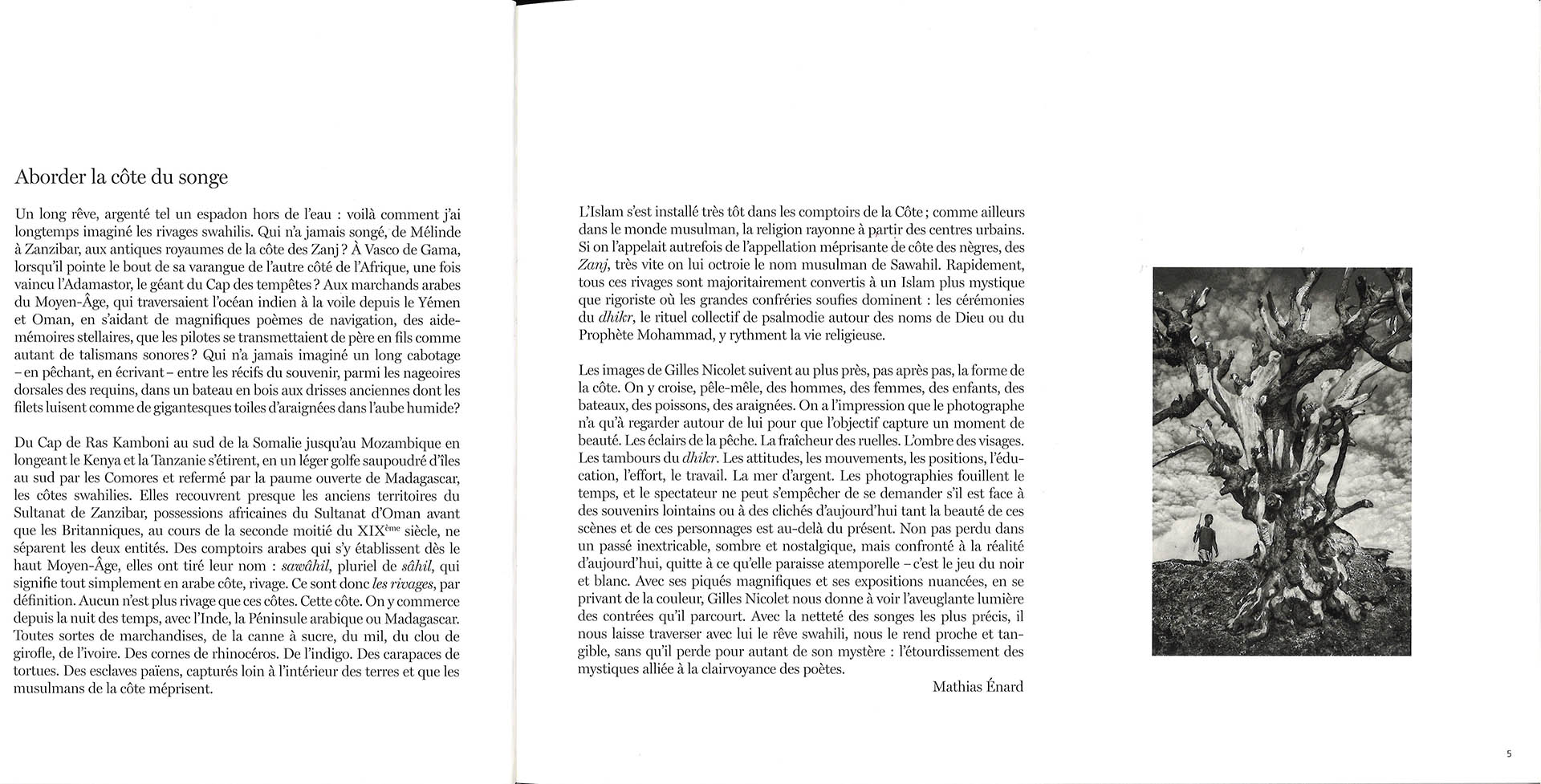 Du Cap de Ras Kamboni au sud de la Somalie jusqu’au Mozambique en longeant le Kenya et la Tanzanie s’étirent, en un léger golfe saupoudré d’îles au sud par les Comores et refermé par la paume ouverte de Madagascar, les côtes swahilies… On y commerce depuis la nuit des temps, avec l’Inde, la Péninsule arabique ou Madagascar. Toutes sortes de marchandises, de la canne à sucre, du mil, du clou de girofle, de l’ivoire. Des cornes de rhinocéros. De l’indigo. Des carapaces de tortues. Des esclaves païens, capturés loin à l’intérieur des terres et que les musulmans de la côte méprisent. Les images de Gilles Nicolet suivent au plus près, pas après pas, la forme de la côte. On y croise, pêle-mêle, des hommes, des femmes, des enfants, des bateaux, des poissons, des araignées. On a l’impression que le photographe n’a qu’à regarder autour de lui pour que l’objectif capture un moment de beauté. Les photographies fouillent le temps, et le spectateur ne peut s’empêcher de se demander s’il est face à des souvenirs lointains ou à des clichés d’aujourd’hui tant la beauté de ces scènes et de ces personnages est au-delà du présent.